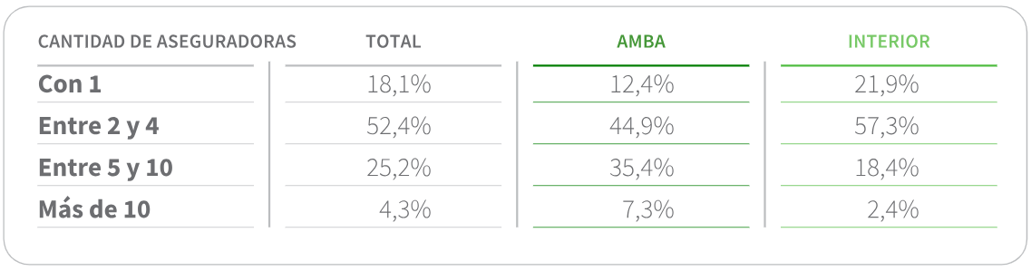 Respecto a la cantidad de aseguradoras con las que operan, el 70,4% de los productores trabajan con hasta cuatro aseguradoras. Existe una diferencia notable entre el AMBA (57,3%) y el resto del país (79%) en este aspecto. La distribución de la cantidad de aseguradoras con las que operan los productores es la siguiente: