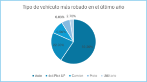 Los autos particulares encabezaron la lista de vehículos más robados con el 59,2% de los casos, seguidos por las 4×4 pick up (22%), utilitarios (9,6%), motos (6%) y camiones (2,7%).