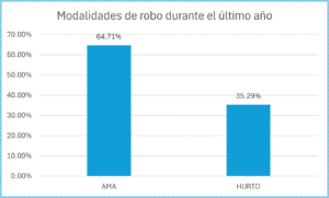 En cuanto a las modalidades, el robo a mano armada (AMA) fue el predominante durante 2025, concentrando el 64,7% de los hechos, siendo diciembre el mes de mayor incidencia alcanzando el 78,4%. Por su parte, los hurtos representaron el 35,3% del total anual.