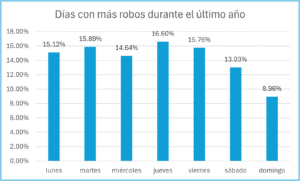 El jueves fue el día con mayor cantidad de robos vehiculares, con el 16,6% de los casos. Sin embargo, el análisis anual muestra una distribución pareja entre el resto de los días: martes (15,9%), viernes (15,8%), lunes (15,1%), miércoles (14,6%) y sábado (13%). En contraste, el domingo fue el día con menor cantidad de robos, con el 9% del total anual.