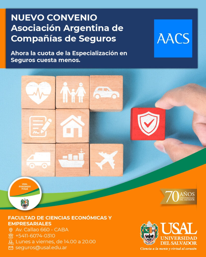 La Asociación Argentina de Compañías de Seguros (AACS) firmó un convenio con la Facultad de Ciencias Económicas y Empresariales de la Universidad del Salvador ofreciendo descuentos en la Especialización en Seguros a sus afiliadas y/o funcionarios.