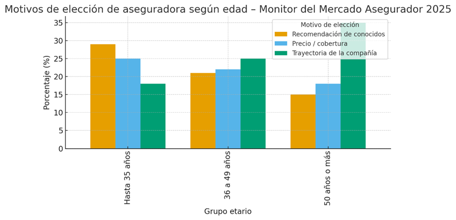 En los segmentos más jóvenes ganan peso la recomendación de conocidos y el precio, mientras que en los mayores de 50 años predomina la confianza en la trayectoria de la aseguradora.
