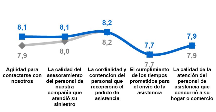 En los siniestros de hogar y comercio, el avance se concentra en la atención general del siniestro, aunque se observan mayores diferencias entre empresas. En el comparativo con el año anterior, el mercado manifiesta promedios crecientes en la atención del siniestro integral y estables en la evaluación del servicio de asistencia.