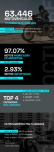 En relación al origen, del total de patentamientos, el 97,1% corresponde a motos fabricadas en la Argentina, con 61.587 unidades. Asimismo, las motos importadas representaron el 2,9% restante, con 1.859 unidades.