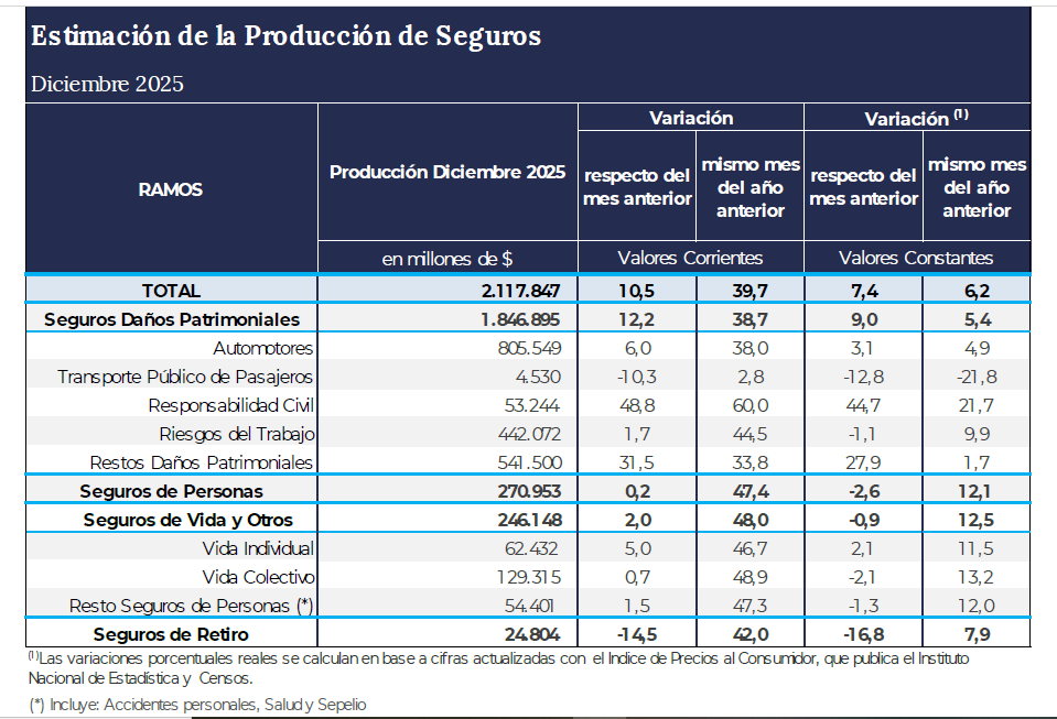 A valores constantes y comparados con diciembre de 2024, los seguros patrimoniales avanzaron un 5,4% y los de personas crecieron un 12,1% a diciembre pasado. Respecto del primer segmento, se incrementaron casi todos los ramos: responsabilidad civil (21,7%), riesgos del trabajo (9,9%), automotores (4,9%) y resto de seguros patrimoniales (1,7%). Sin embargo, transporte público de pasajeros registró una fuerte caída del 21,8%.