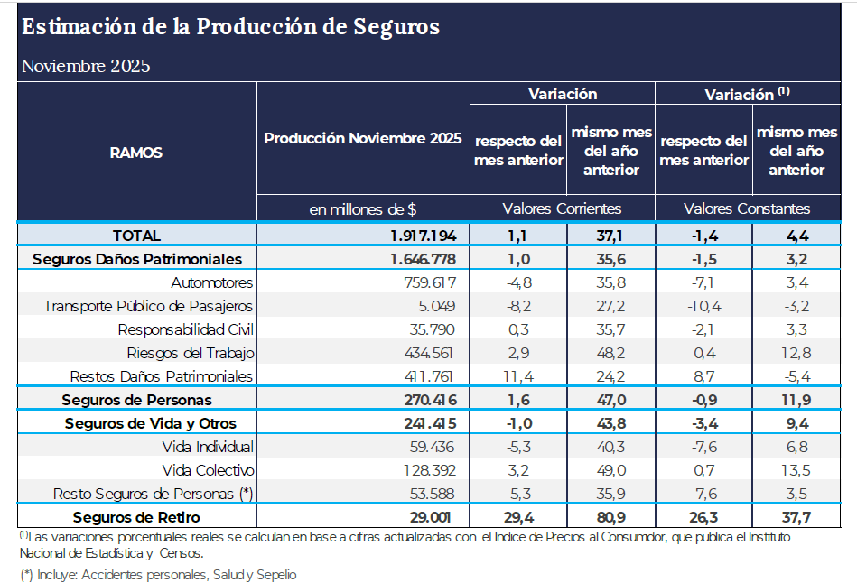 De acuerdo con una reciente circular de la Superintendencia de Seguros de la Nación (SSN), las ventas del mercado asegurador durante noviembre de 2025 alcanzaron los 1.917,2 miles de millones de pesos. De esta manera, a valores corrientes, la producción creció un 37,1% respecto de noviembre de 2024. En tanto, a valores constantes, el avance respecto del mismo mes del año anterior fue del 4,4%, pero retrocedió un 1,4% en la comparación intermensual.