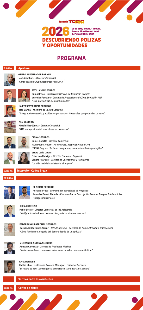 La inscripción para la jornada, que se desarrollará entre las entre las 9 y las 14 horas, se encuentra cerrada por haberse registrado más de 1.200 personas. Los disertantes representan a aseguradoras, empresas de asistencia y proveedores que expondrán frente a una platea principalmente compuesta por productores asesores de seguros. A continuación, Todo Riesgo detalla horarios, expositores y temáticas que serán abordadas en el encuentro.