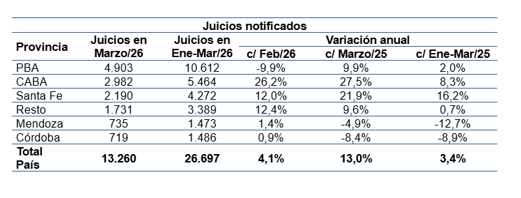 Además, el ingreso de juicios presentó un aumento del 13% contra marzo de 2025 y supera también los registros del mes pasado. Con estos números, en los últimos doce meses ingresaron 135 mil juicios, lo que representa un flujo de más de 11 mil demandas cada mes.