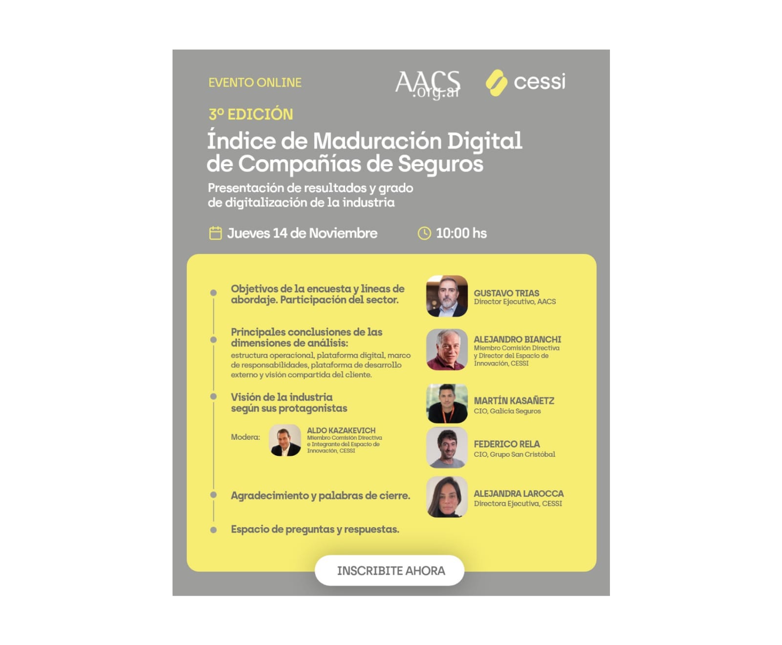 También tendrá lugar un panel donde Martín Kasañetz, CIO de Galicia Seguros, y Federico Rela, CIO de Grupo San Cristóbal, expondrán su visión del mercado. El evento finalizará con unas palabras de Alejandra Larocca, Directora Ejecutiva de CESSI.