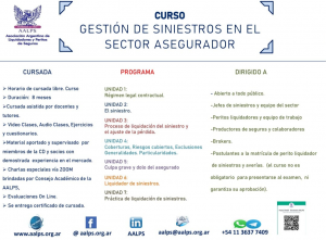 La Asociación Argentina de Liquidadores y Peritos de Seguros (AALPS) anunció que está abierta la inscripción al curso “Gestión de siniestros en el sector asegurador”. Comenzará el 10 de abril, durará ocho meses y se dictará de modo 100% online. Está dirigido a todo público y, en especial, a jefes y equipos de Siniestros, a peritos liquidadores y sus equipos de trabajo, a los productores y sus empleados, a brokers y a postulantes a la matrícula de perito liquidador de siniestros y averías.