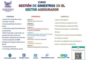 La Asociación Argentina de Liquidadores y Peritos de Seguros (AALPS) anunció que está abierta la inscripción al curso “Gestión de siniestros en el sector asegurador”. Comenzará el 14 de agosto, durará ocho meses y se dictará de modo 100% online. Está dirigido a todo público y, en especial, a jefes y equipos de Siniestros, a peritos liquidadores y sus equipos de trabajo, a los productores y sus colaboradores, a brokers y a postulantes a la matrícula de perito liquidador de siniestros y averías.