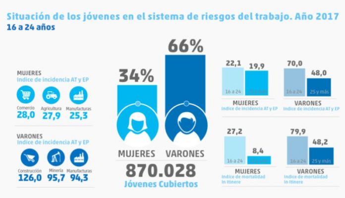 El informe de la SRT detalló que, en 2017, la población de 16 a 24 años cubierta por el sistema de riesgos del trabajo (trabajadores registrados en zonas urbanas y rurales de todo el país) fue de 870.028 jóvenes, compuesta en un 34% por mujeres y en un 66% de varones.