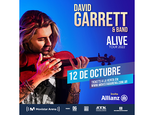 Con el acompañamiento de Allianz, el violinista David Garrett anunció su gira Alive Tour y como parte de ella se presentará el 12 de octubre en el Movistar Arena. Las entradas ya están a la venta en el sitio web oficial del establecimiento.