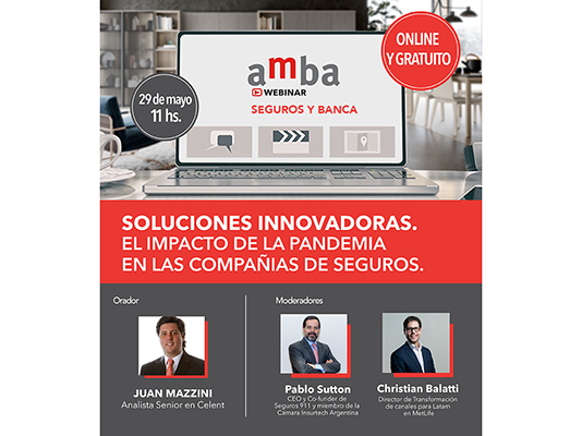 AMBA organiza para el próximo 29 de mayo, a las 11 horas, el webinar «Soluciones innovadoras. El impacto de la pandemia en las compañías de seguros». El evento, totalmente gratuito, tendrá como panelista principal a Juan Mazzini, analista senior en Celent. Además, contará con los moderadores Pablo Sutton, CEO y co-fundador de Seguros 911, y Christian Balatti, director de Transformación de Canales para Latam en MetLife.