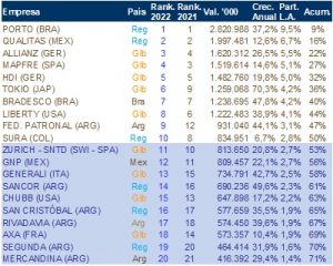 En tanto, los países con más alto crecimiento de primas entre diciembre de 2021 y diciembre de 2022 fueron Brasil (40%), la Argentina (39%), Uruguay (23%), Colombia (15%) y México y Bolivia (ambos con el 13%). En su conjunto, la región creció un 26%.