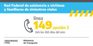 La línea de atención telefónica 149 opción 2 es un servicio gratuito que funciona en todo el país. Está focalizado en la asistencia a las víctimas de siniestros viales y a sus familias. Las víctimas pueden llamar durante las 24 horas, todos los días y desde cualquier lugar del país. De esta forma, reciben acompañamiento y asistencia psicológica, asesoramiento jurídico, rehabilitación médica, traslados y gestiones ante organismos públicos y privados en la post-emergencia, entre otros recursos. Las personas que se comunican con la Línea 149 son atendidas por un equipo multidisciplinario compuesto por trabajadores sociales, psicólogos y abogados, entre otros profesionales. Ellos orientan y acompañan a las víctimas luego de un siniestro vial.