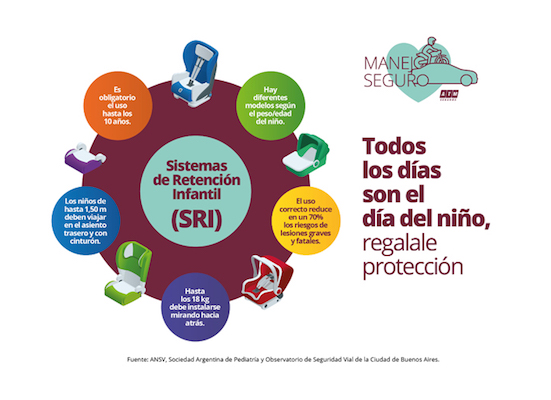 A pesar de que la Ley de Tránsito 24.449 exige el uso de algún sistema de retención infantil (SRI) -usualmente llamados “sillitas” o “huevitos”-, no todos lo usan o lo saben emplear correctamente. Según datos del Observatorio de Seguridad Vial del Gobierno de la Ciudad de Buenos Aires relevados en 2018, sólo uno de cada tres niños y bebés que viajan en vehículos particulares por la Ciudad lo hacen de manera segura.