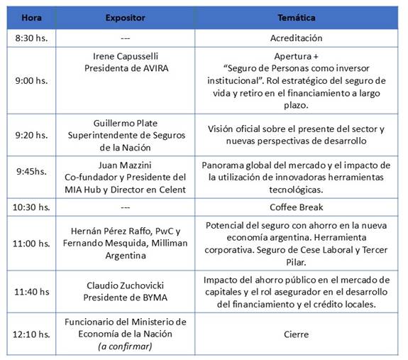 La Asociación Civil de Aseguradores de Vida y Retiro de la República Argentina (AVIRA) anunció que se encuentra abierta la inscripción para participar del 18° Seminario Internacional de Seguros de Vida y Retiro, que se puede realizar aquí.