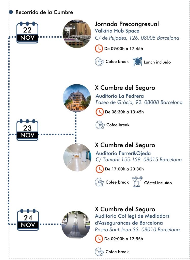 Además, vale la pena destacar que el evento se llevará a cabo en cuatro escenarios de la ciudad de Barcelona. Una jornada precongresual, el día 22 de noviembre, en el Valkiria Hub Space. La jornada central, el día 23, en el emblemático edificio de La Pedrera y en el Auditorio de Ferrer&Ojeda. Y, para finalizar, el 24 de noviembre, en la sede del Col·legi de Mediadors d’Assegurances de Barcelona.