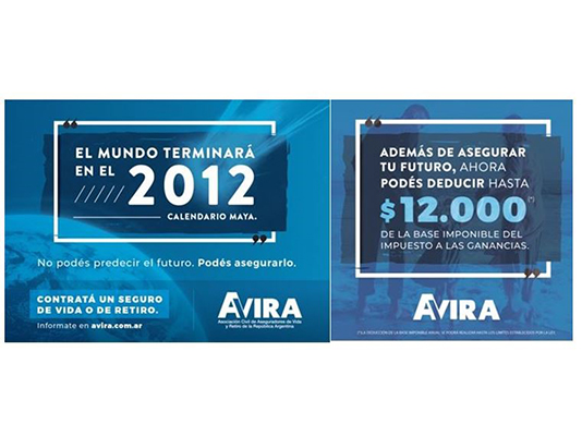 Con el lema “No podés predecir el futuro, podés asegurarlo”, AVIRA difunde a través de una serie de famosas predicciones no cumplidas el concepto básico de las coberturas de vida y de retiro: garantizar hoy las herramientas de prevención económica para el mañana o para enfrentar eventualidades con coberturas adecuadas a las necesidades de cada uno, y con el adicional de contar con la posibilidad de beneficiarse con la posibilidad de desgravar hasta 12 mil pesos por cada póliza de vida o de retiro contratada.