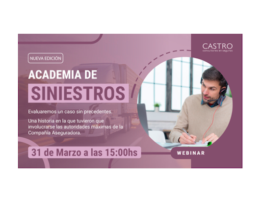 En el regreso de “Academia de Siniestros”, Castro Consultores invita a recorrer el caso y el rol de productor asesor de seguros frente a la compañía. La cita es el miércoles 31 de marzo a las 15 horas. El webinar durará una hora, es sin cargo y los cupos son limitados. Para inscripciones, ingresar aquí.