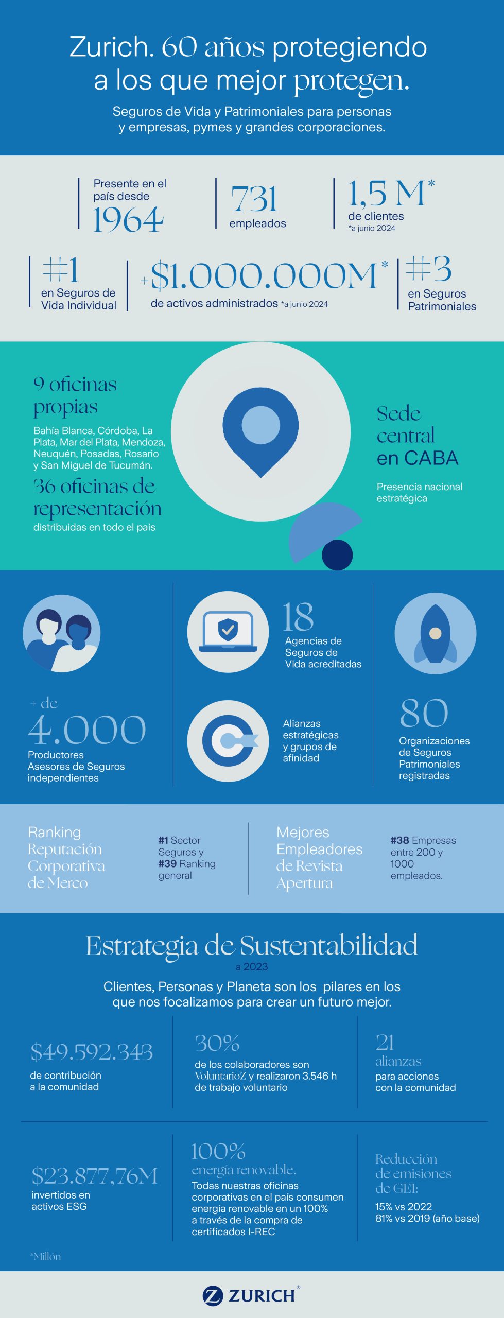 “Zurich cumple 60 años en la Argentina ayudando a personas y empresas a comprender los riesgos y protegerse de ellos. Con sede central en la Ciudad de Buenos Aires, la compañía líder de la industria de seguros se encuentra en plena expansión de su red de cobertura local, integrada por nueve oficinas propias y 36 oficinas delegadas de representación distribuidas estratégicamente en todo el país, alianzas, partners, grupos de afinidad y más de 4 mil profesionales independientes, altamente capacitados para brindar un asesoramiento profesional”, destacaron desde la aseguradora.