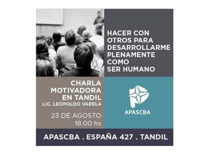 La Asociación de Productores del Centro de la Provincia de Buenos Aires (APASCBA) organiza para el próximo 23 de agosto, a las 18 horas , la charla motivacional “Hacer con otros para desarrollarme plenamente como ser humano”, dictada por Leopoldo Varela. La charla se llevará adelante en la sede de APASCBA, ubicada en Av. España 427, Tandil.