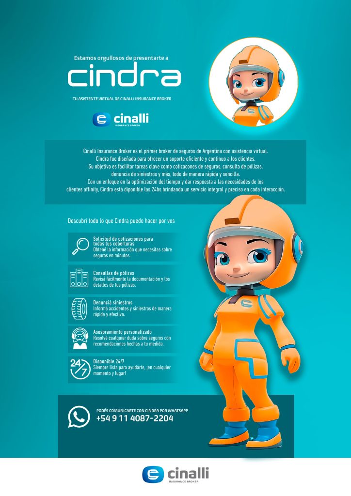 “En nuestro broker de seguros, tenemos como premisa la mejora continua en la atención al cliente. En ese sentido, la innovación y la tecnología se unen para ofrecer una experiencia de atención al cliente eficiente, personalizada y accesible las 24 horas del día, los siete días de la semana. Les presentamos a Cindra, nuestra asistente virtual diseñada para facilitar y personalizar, aún más, la experiencia de nuestros clientes con nosotros”, contaron desde Cinalli Insurance Broker.