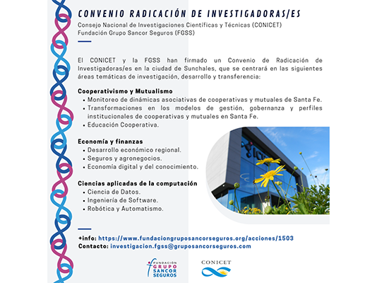 La Fundación Grupo Sancor Seguros (FGSS) trabaja en el desarrollo de un Polo Académico – Científico – Tecnológico en la ciudad santafesina de Sunchales y su región. Allí se encuentran radicados su Instituto Cooperativo de Enseñanza Superior (ICES) y el CITES, la aceleradora científico-tecnológica del Grupo Sancor Seguros (GSS). En este marco, la FGSS y el Consejo Nacional de Investigaciones Científicas y Técnicas (CONICET) firmaron un Convenio de Radicación de Investigadores en dicha ciudad.