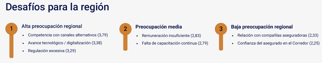 El documento identifica distintos niveles de preocupación sobre temas que afectan al canal. La competencia con canales alternativos, el avance tecnológico y la digitalización, junto con la percepción de una regulación excesiva, aparecen como las inquietudes más marcadas entre los participantes del estudio. En un nivel intermedio se ubican la remuneración considerada insuficiente y la falta de capacitación continua. En cambio, la relación con las compañías aseguradoras y la confianza del asegurado en el corredor son percibidas como desafíos de menor intensidad dentro del contexto regional.