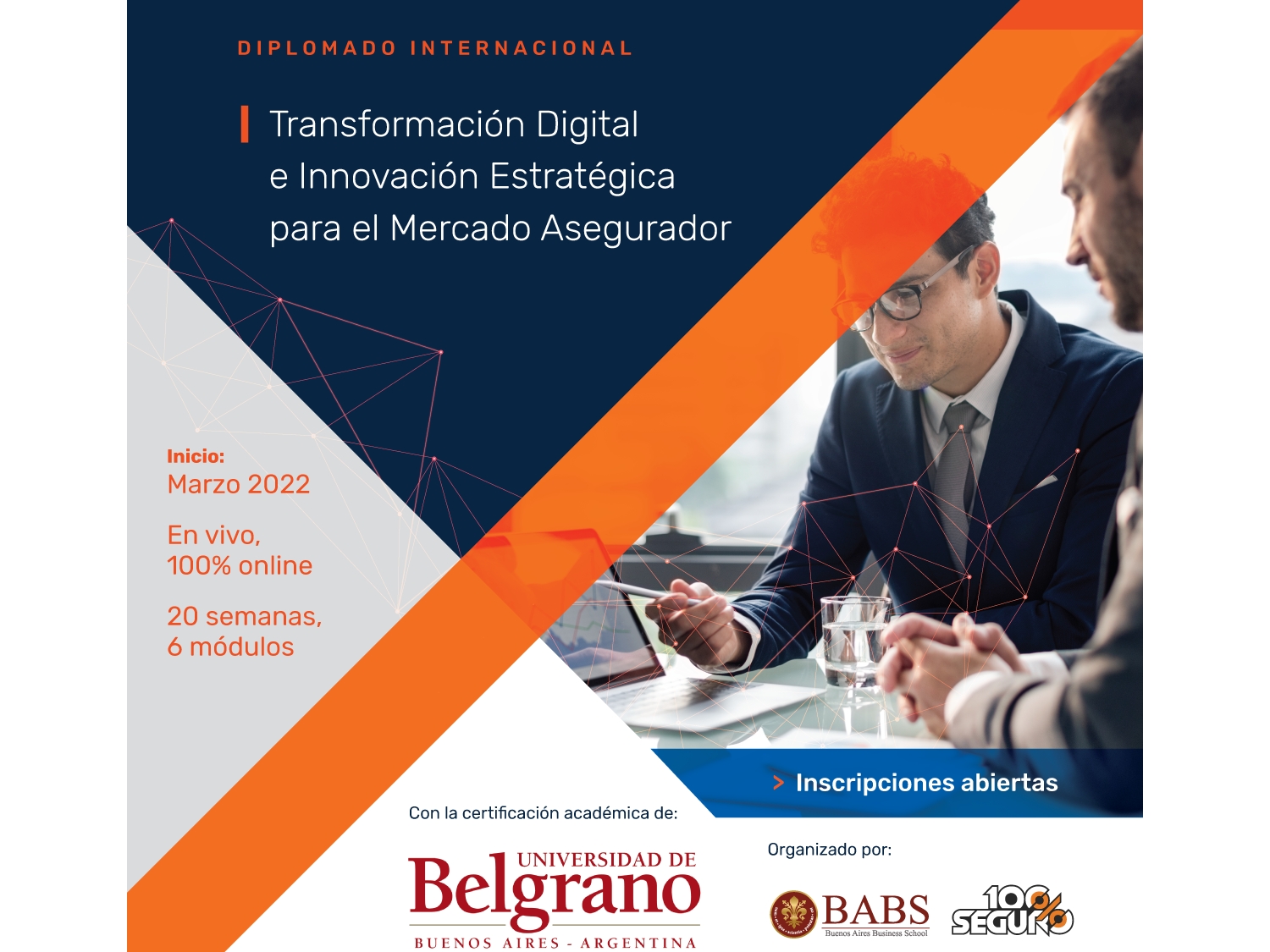 Ya están abiertas las inscripciones para una diplomatura única en Latinoamérica centrada en las últimas tendencias del mercado asegurador. Se trata de la primera edición del Diplomado Internacional en Transformación Digital e Innovación Estratégica del Mercado Asegurador. Comenzará en marzo 2022 con un destacado staff académico y charlas magistrales.