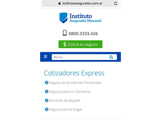 Para perfeccionar la experiencia de contratación de sus coberturas, el Instituto Asegurador Mercantil desarrolló el Cotizador Express para teléfonos celulares. De forma rápida y simple se puede cotizar y solicitar pólizas de accidentes personales, comercio, hogar y garantía de alquiler ingresando desde un dispositivo móvil a www.institutoasegurador.com.ar. Seleccionando el botón verde de la opción “Cotizá tu seguro”, se despliegan cuatro alternativas.