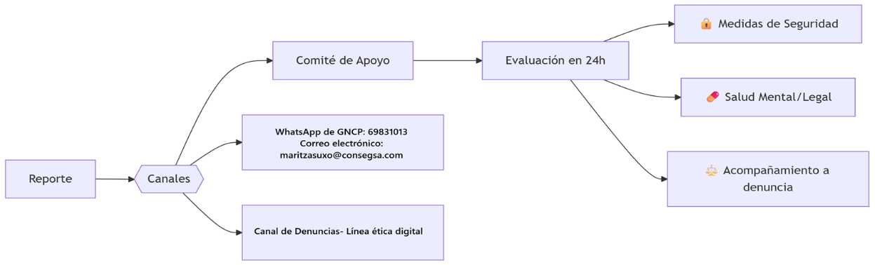 CONSEGSA cuenta con un Protocolo Integral de Prevención y Actuación frente a Violencia de Género y Acoso Laboral, aplicable a todos los colaboradores/as, en cumplimiento de la Ley N° 348 de Bolivia y el Convenio 190 de la OIT.