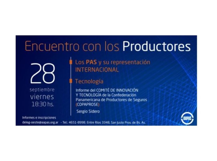 El próximo viernes 28 de septiembre se realizará un encuentro de productores en la Delegación Oeste de la Asociación Argentina de Productores Asesores de Seguros (AAPAS).