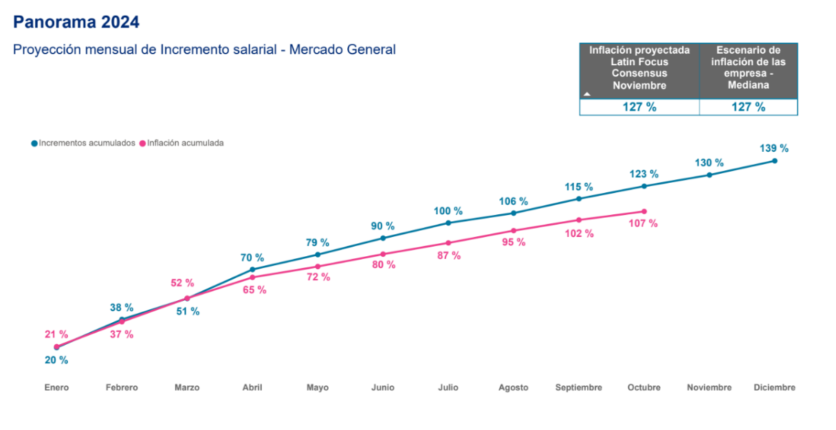 La proyección de inflación privada para 2024 también disminuyó, situándose en 127% (Latin Focus – noviembre 2024), en línea con las estimaciones de las empresas. Este ajuste refleja una cautela generalizada en el sector privado, mientras las compañías buscan adaptarse al panorama macroeconómico actual. Sin embargo, las condiciones de incertidumbre económica y fluctuaciones en los costos continúan representando retos importantes para las empresas al planificar sus presupuestos salariales.