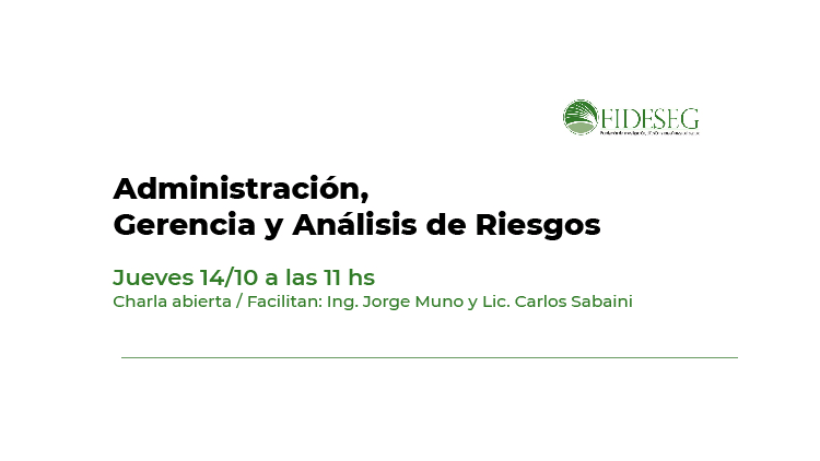 La Fundación de Investigación, Difusión y Enseñanza del Seguro (FIDESEG) organiza la charla “Administración, gerencia y análisis de riesgo”. El encuentro se realizará a través de la plataforma Zoom el jueves 14 de octubre a las 11 horas.