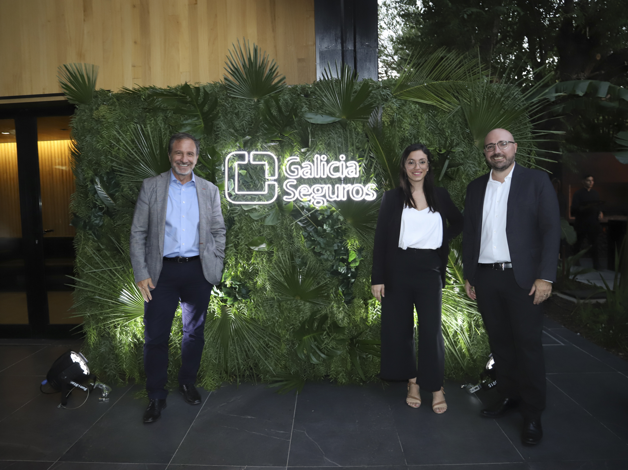 Gonzalo Santos Mendiola, Romina López Frontini y Lucas Di Bin, gerente general, gerente de Marketing y Experiencia y gerente Comercial, Productores y Técnica de Galicia Seguros, respectivamente.