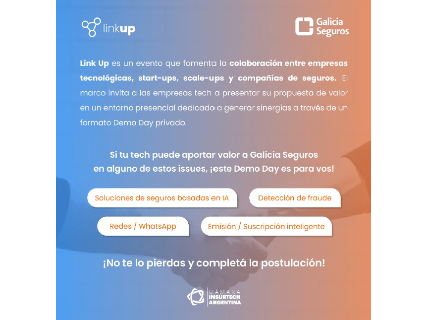 Para postularse es necesario ser miembro de la Cámara Insurtech Argentina o estar en proceso de ingreso y mapeado en insurmap. El formulario de alta al evento se puede completar hasta el 5 de agosto. Luego, Galicia Seguros seleccionará a los seis mejores casos para la presentación en la jornada Link Up!