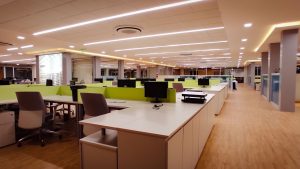 El layout propuesto para las oficinas agrupa los espacios semiprivados de subgerentes y jefes alrededor de las columnas históricas del centenario edificio, logrando de esta manera una máxima continuidad visual y sensación de amplitud. A su vez, se destacan el innovador sistema de aire incorporado que aúna un diseño contemporáneo y futurista con una máxima eficiencia energética. También es relevante el sistema de iluminación LED lineal modular que rompe con la tradición de los utilizados habitualmente para espacios corporativos.