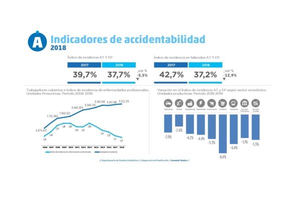 El índice de incidencia de AT y EP en unidades productivas de 2018 fue del 37,7, un 5,5% menor que en 2017. Al tomar la cantidad de trabajadores fallecidos se percibió una baja del 12,2%, determinando un descenso del índice de incidencia de fallecidos del orden del 12,8% respecto de 2017. Es decir, hubo 37,2 casos mortales en ocasión del trabajo cada millón de trabajadores cubiertos. Además, se observó un descenso del 10,3% en la incidencia de la accidentabilidad in itinere, cifra que representó un 12,8 menos de accidentes de trayecto cada mil trabajadores cubiertos.