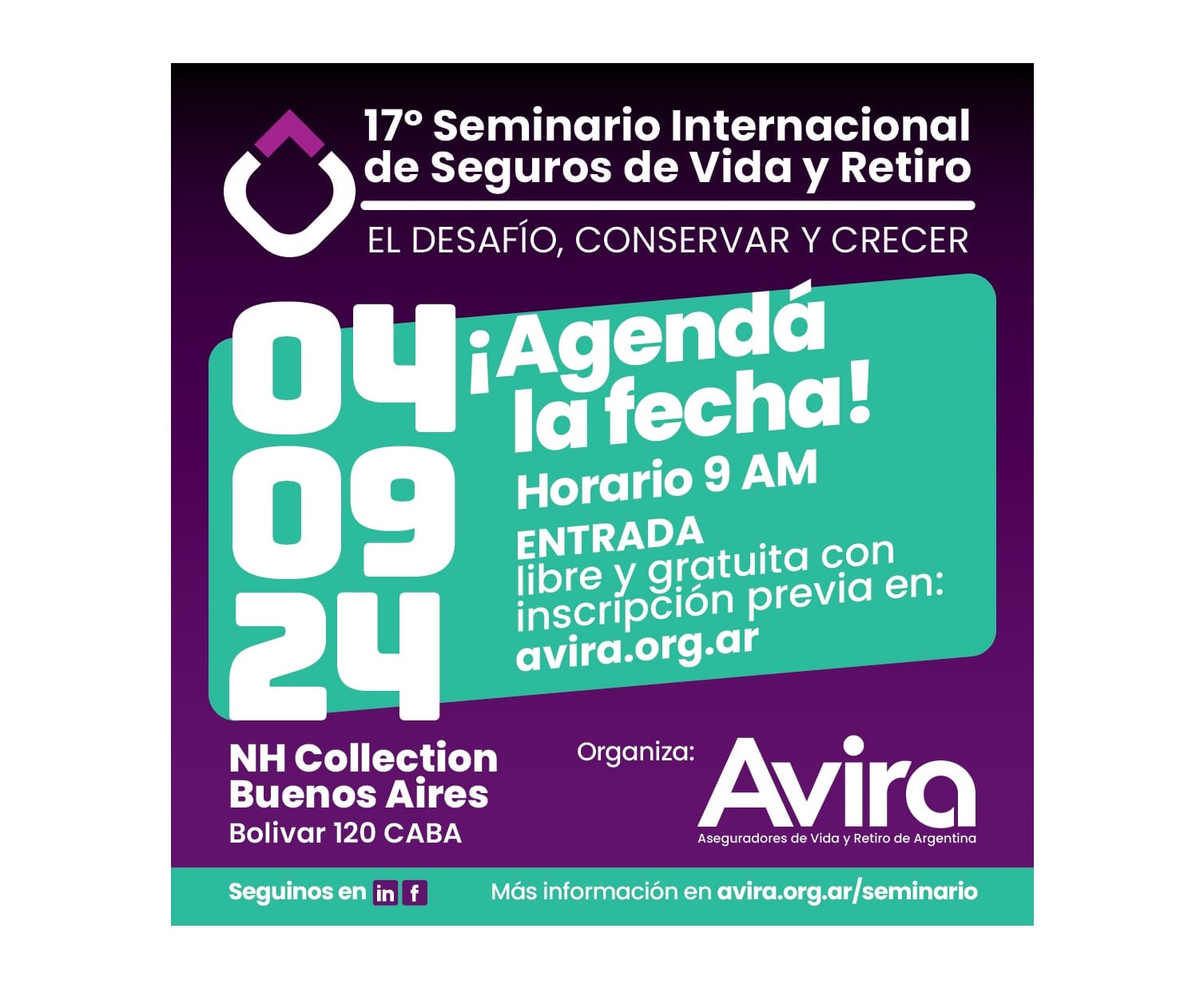 Avira anuncia que ya está abierta la inscripción a su 17° Seminario Internacional de Seguros de Vida y Retiro, que se realizará el 4 de septiembre a partir de las 8.30 horas en el hotel NH Collection Buenos Aires Centro Histórico (Bolívar 120). El evento es abierto y gratuito, pero requiere inscripción previa en www.avira.org.ar/seminario.
