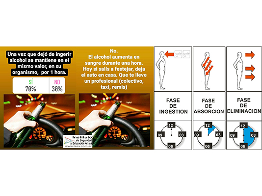 “Siete de cada diez personas desconocen cómo funciona el alcohol en el cuerpo humano. Luego de la ingesta, durante la primera hora se produce la ‘absorción’ donde el alcohol en la sangre aumenta y alcanza el cerebro. Recién una hora después de la última ingesta se inicia su proceso de ‘eliminación’. Por ejemplo, tomando dos vasos de whisky, se adquiere una alcoholemia de un g/L (gramo por litro) y se tardan seis horas en eliminar su contenido etílico (en la primera se absorbe y luego se elimina 0,2 g/L por hora)”, explicaron desde el ISEV.