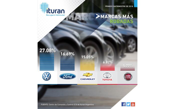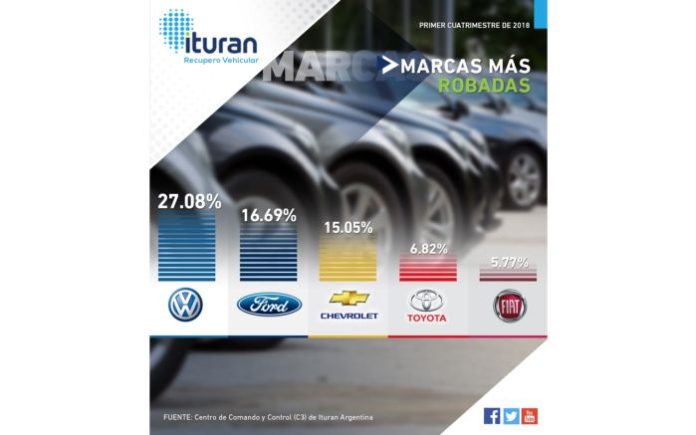 Volkswagen lideró la primera posición, con un 32,2% de índice promedio del total de robos registrados en el área metropolitana y del Gran Buenos Aires. En segundo lugar, con el 16,8%, se encuentra Ford y, en tercer lugar, Chevrolet con el 13,3% sobre el total de robos realizados en el primer cuatrimestre de 2018. En comparación con los primeros cuatro meses de 2017, el ranking se mantiene sin variación de posiciones.
