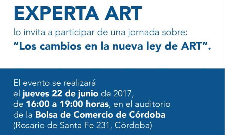 Experta ART anunció la realización de la jornada “Los cambios en la nueva Ley de Riesgos del Trabajo”, a llevarse a cabo en Córdoba el próximo jueves 22 de junio a partir de las 16 horas, en el auditorio de la Bolsa de Comercio de la provincia (Rosario de Santa Fe 231). En el encuentro, un grupo de especialistas en la temática analizará la nueva Ley de Riesgos del Trabajo N° 27.348. El sistema hoy cubre a 9,7 millones de trabajadores y a 1,6 millón de empleadores afiliados.