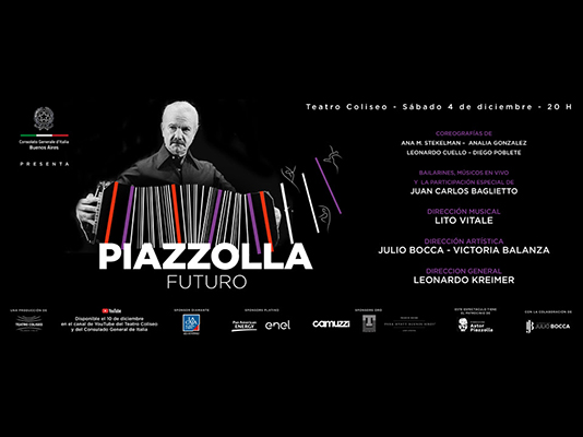 Comprometida con el crecimiento y el desarrollo de la actividad cultural y de difusión, La Caja acompaña la nueva edición de Italia XXI, una iniciativa del Teatro Coliseo. “Piazzolla Futuro” es el quinto episodio del ciclo 2021 y contará con un reconocido elenco de danza e intérpretes musicales y la participación especial de Juan Carlos Baglietto. Presentarán un espectáculo de danza y multimedia.