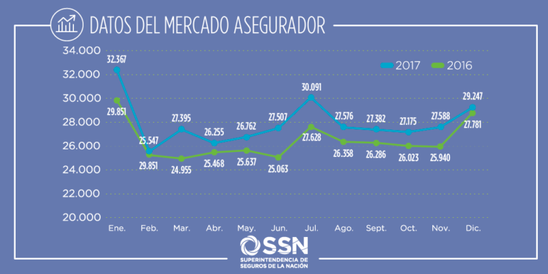 Durante 2017, la producción total de seguros creció todos los meses respecto de 2016. Puntualmente en diciembre 2017, las ventas alcanzaron los 29.247 millones de pesos, “evidenciando el crecimiento de la industria aseguradora”.