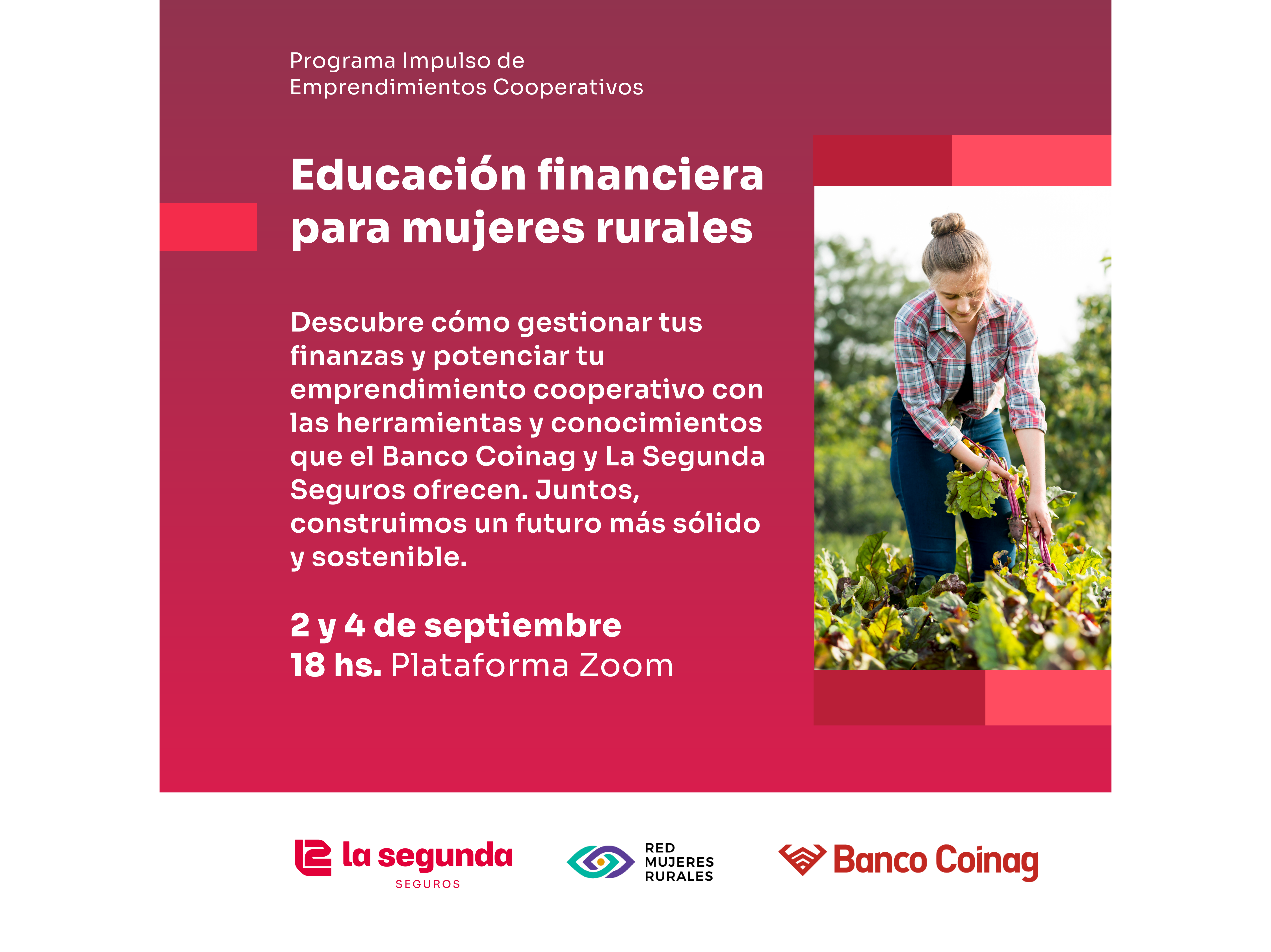 En el marco del programa Impulso de Emprendimientos Cooperativos, que ya va por su cuarta edición, La Segunda Seguros en alianza con Banco Coinag lanzan una propuesta formativa dirigida a integrantes de la Red Mujeres Rurales y a toda la comunidad de emprendedoras rurales. Se trata de una capacitación en inclusión y educación financiera, diseñada específicamente para fortalecer los conocimientos y habilidades financieras de las mujeres rurales. Tendrá lugar el 2 y 4 septiembre en dos encuentros de dos horas de forma virtual.
