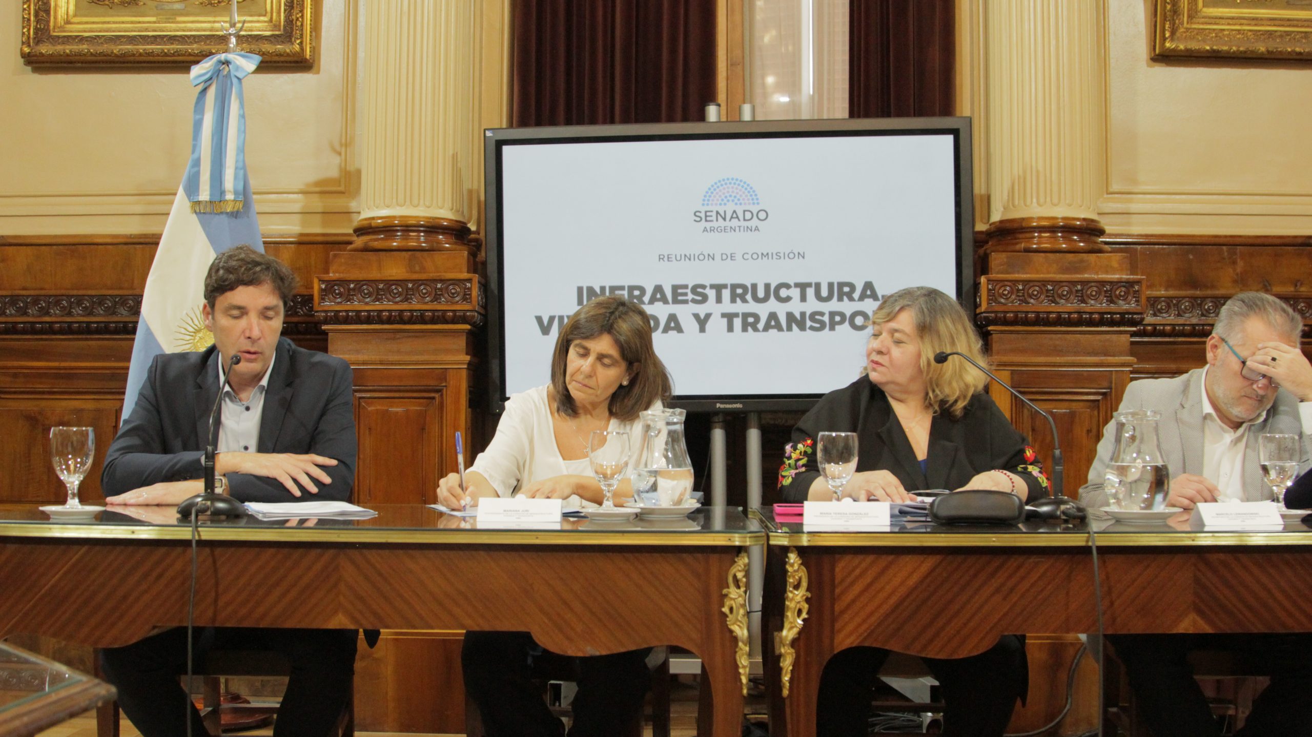 Pablo Martínez Carignano, director ejecutivo de la ANSV, junto a Mariana Juri, senadora nacional por Mendoza; María Teresa González, senadora nacional por Formosa; y Marcelo Lewandowski, senador nacional por Santa Fe. Los parlamentares son, respectivamente, vicepresidenta, presidenta y secretario de la Comisión de Infraestructura, Vivienda y Transporte.