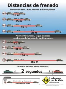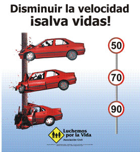 A mayor velocidad, mayor es el tiempo y la distancia que se necesita para detener el vehículo y más graves las consecuencias en caso de choque o vuelco o ante cualquier falla mecánica, el reventón de un neumático, una mala maniobra de otro conductor o cualquier otro imprevisto. La velocidad máxima permitida por las señales o la reglamentación no es siempre la más segura. Es necesario adecuar la velocidad a las circunstancias del camino”, afirmaron.