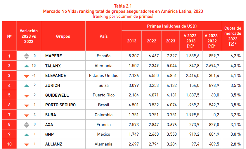 Por grupos, Mapfre encabeza el ranking de no vida con unas primas de 7.327 millones de dólares (el 13,3% más) y una cuota de mercado de 6,2%. Está por delante de otros competidores como la alemana Talanx o la estadounidense Elevance.